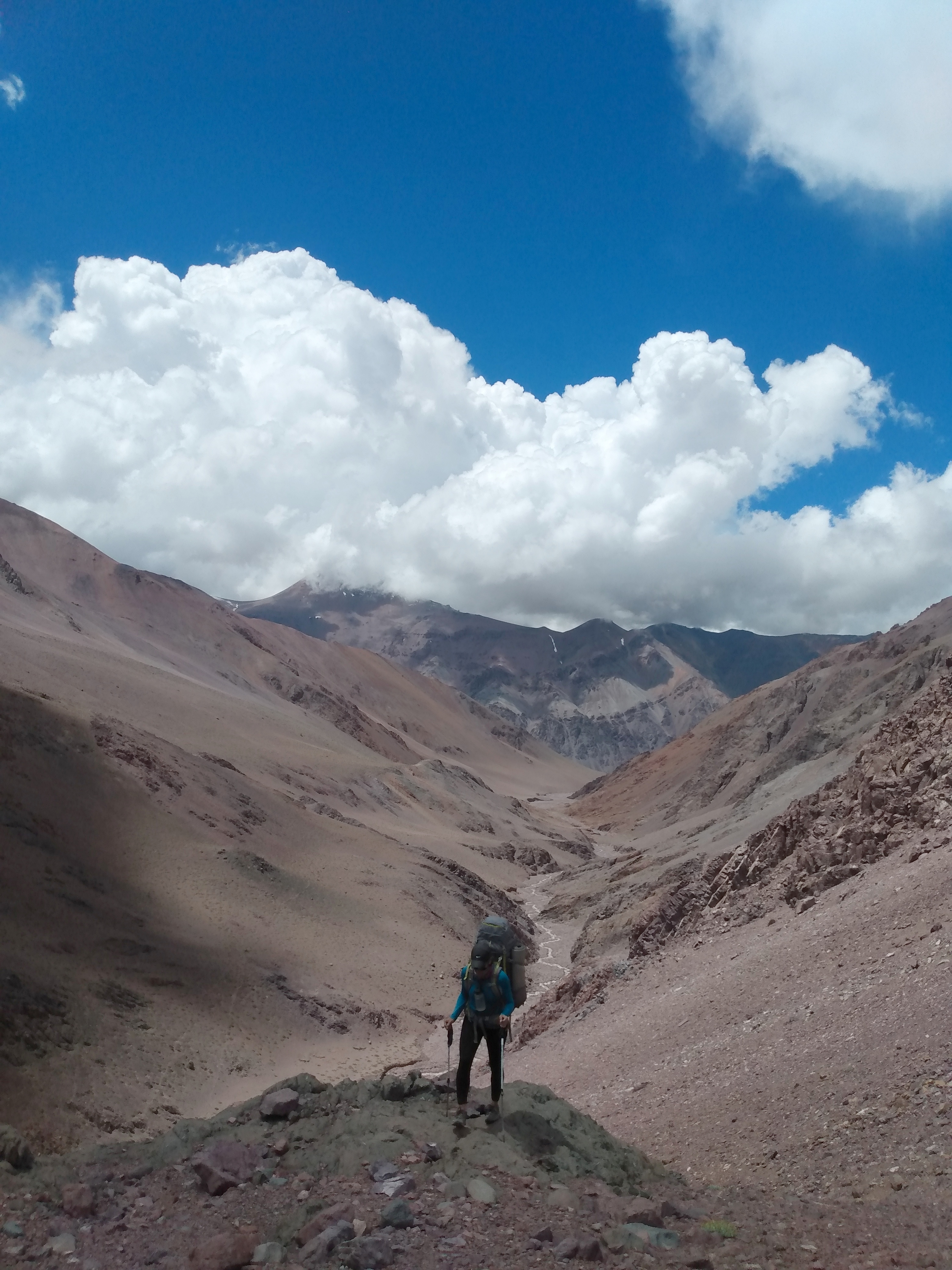 La foto es es de mi cordada y guía en esa expedición, la gran Marcia CB. Ahí vamos saliendo de la quebrada del arroyo San Javier, empezando el segundo día de nuestro intento y a unos 4500 m.s.n.m. Nuestro adelante era la cumbre del nevado Olivares Central (alias nevado de La Majadita) en San Juan, Argentina. Llevábamos ya 8 días internados en la cordillera, con 4 cumbres, y quedaba la última, la más alta, a lo que vinimos. Los cuerpos no querían mucho más, pero las almas querían probar.
